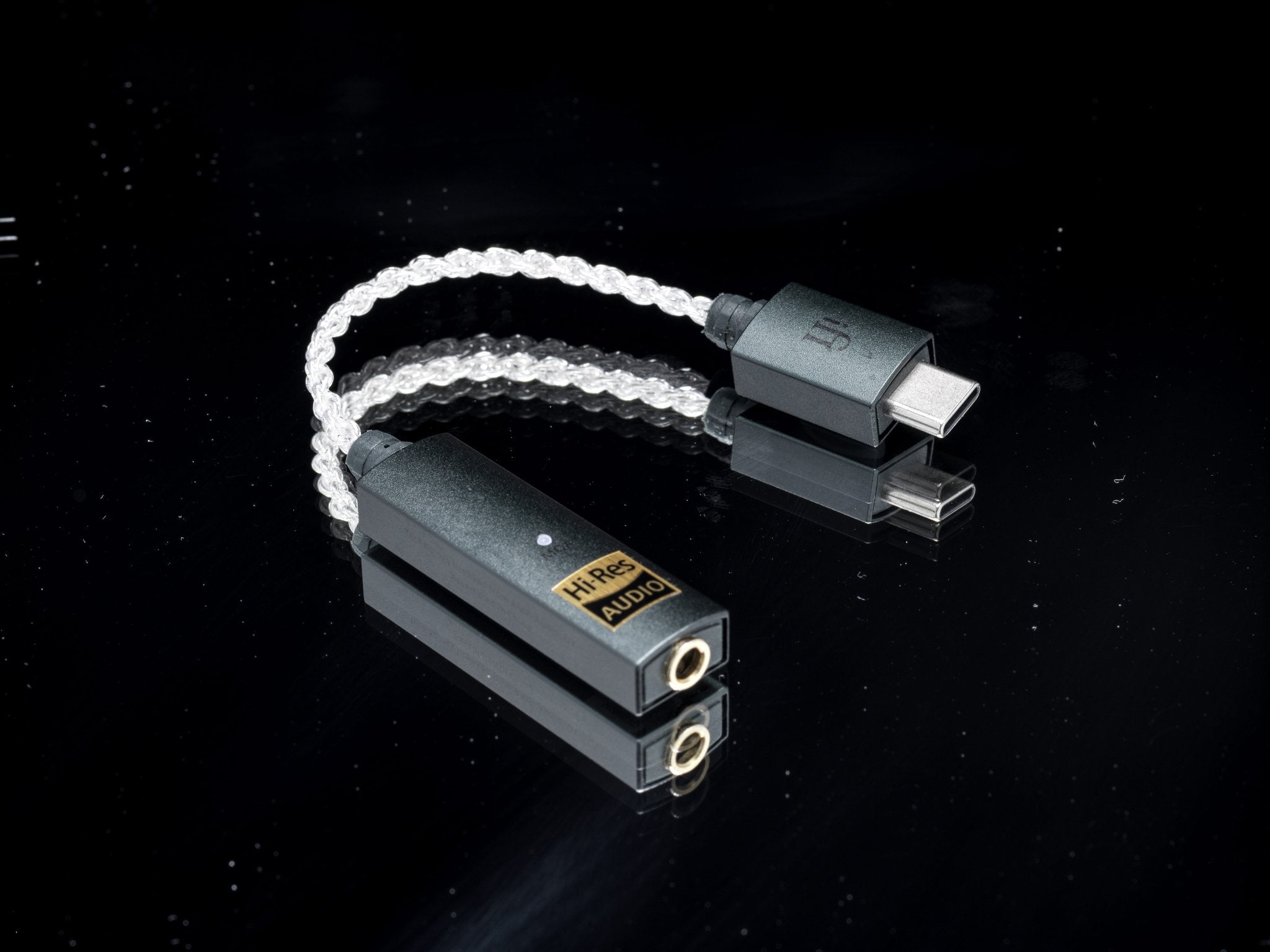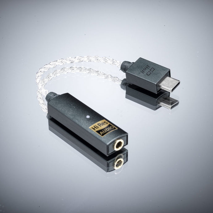 The GO link features a USB-C connector on one end and and at the other is the DAC and headphone amp circuitry, both encased in durable, lightweight magnesium alloy. A 6cm flexible cable in between allows for practical use, angling the DAC/amp toward the listener and minimizing strain on the connected USB port.